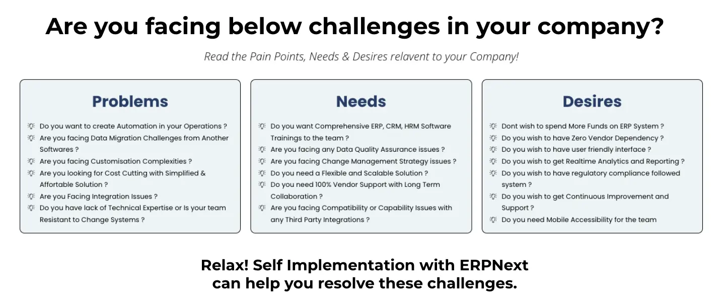 Lets us help you resolve your Needs, Desires, Pain Points from an ERP Software !